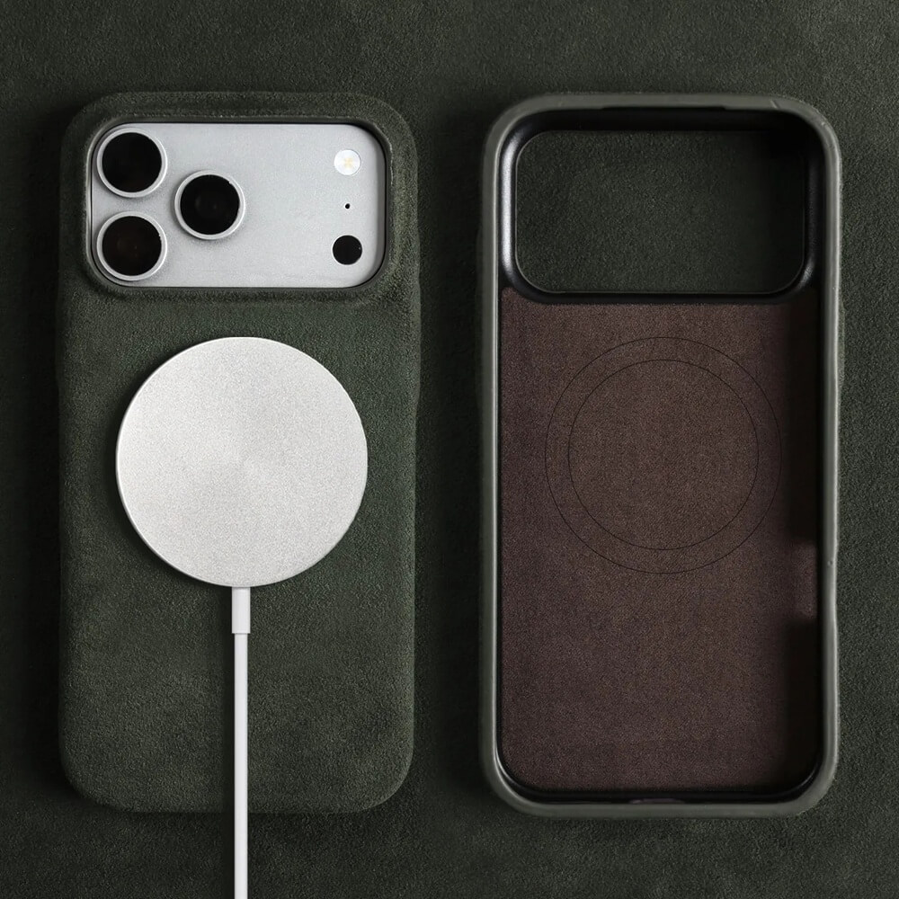 This MagSafe-compatible iPhone case features an Alcantara exterior with a soft matte textile finish and a consistent surface grain. The magnetic charging system is built into the back layer, aligned for wireless charging without exposed rings or printed outlines. Our Alcantara case is available for iPhone 17, 17 Air, 17 Pro, and 17 Pro Max.