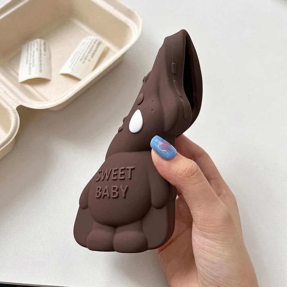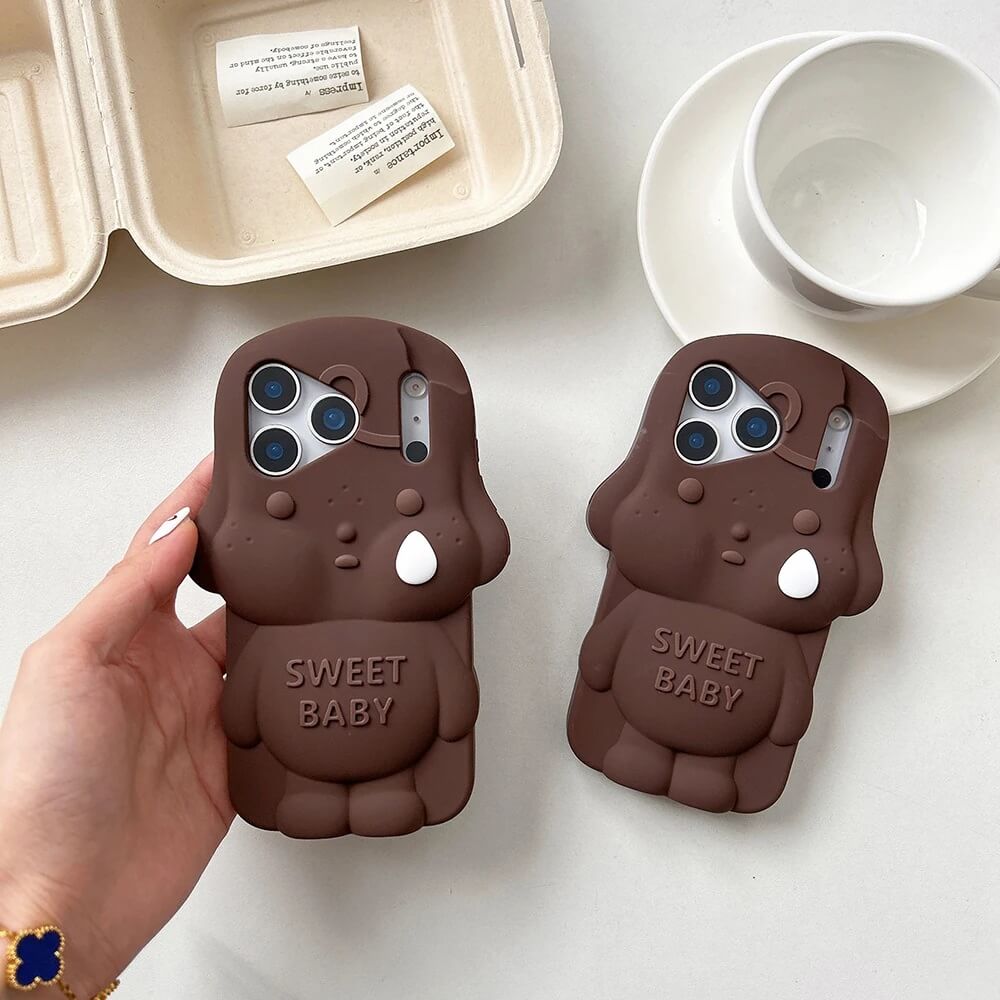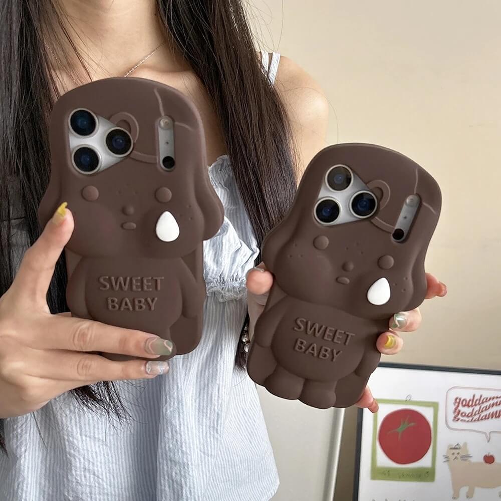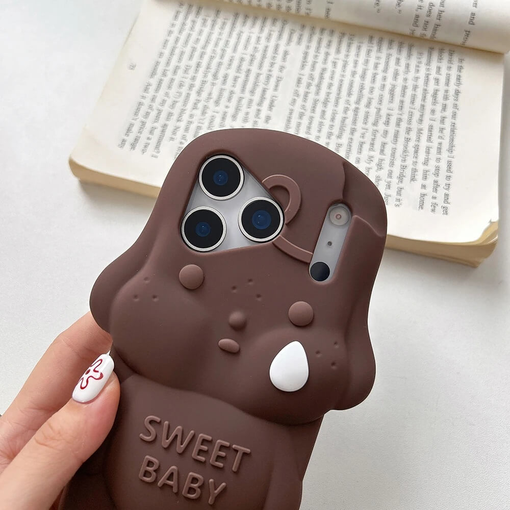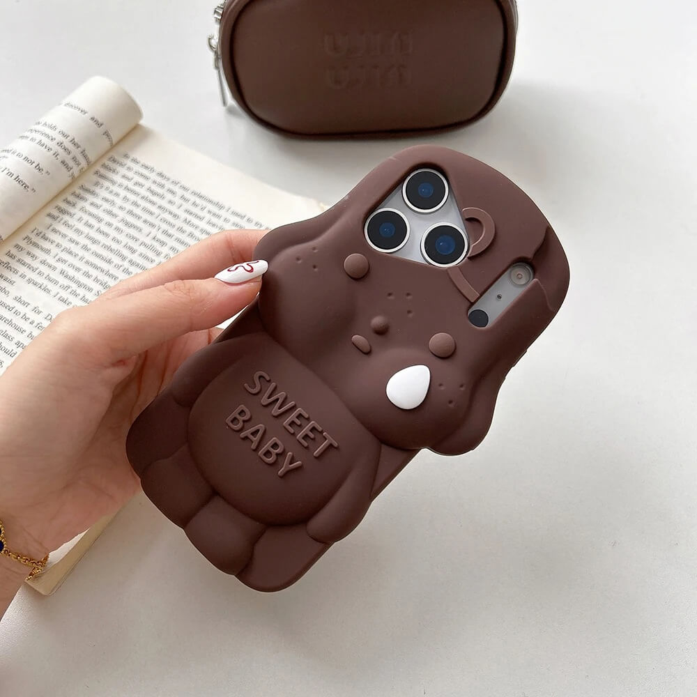 A brown 3D sweet baby dog iPhone case built around a full sculpted figure that rises from the back with rounded ears, closed eyes, and a tear detail set into the face. The body extends outward with soft contours and a smooth finish, while the “SWEET BABY” text sits embedded across the chest without breaking the shape.