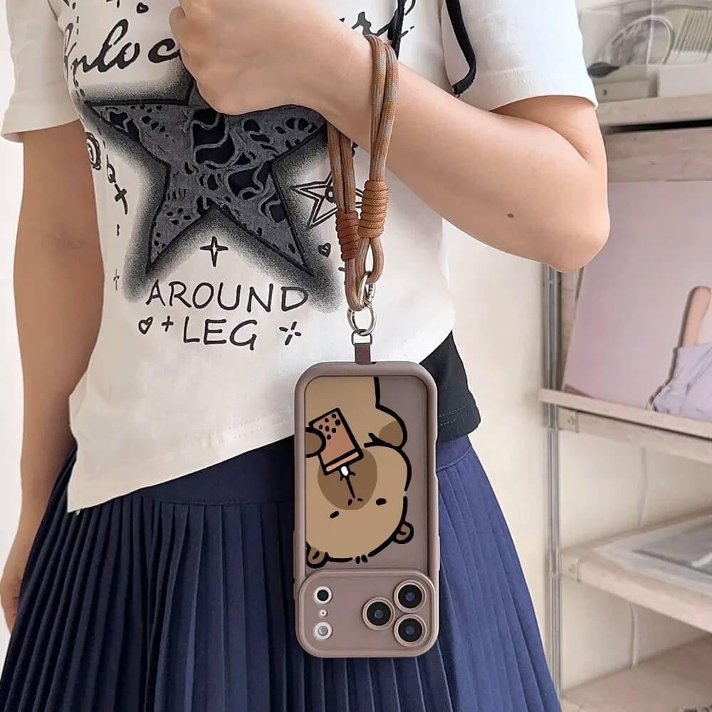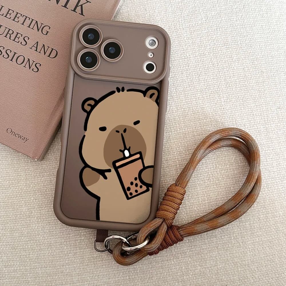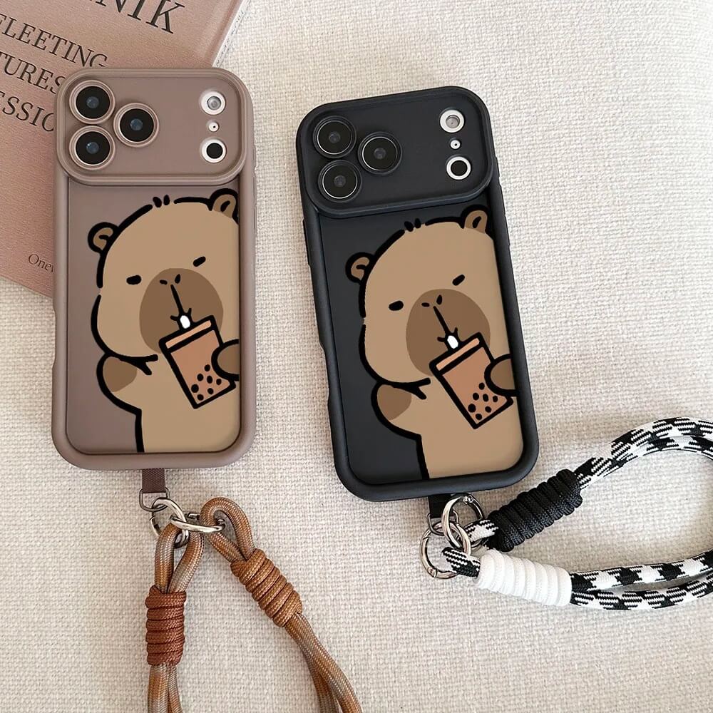 Features: Capybara bubble tea back print, rope lanyard, metal clasp attachment, covered buttons, open camera and port cutouts
