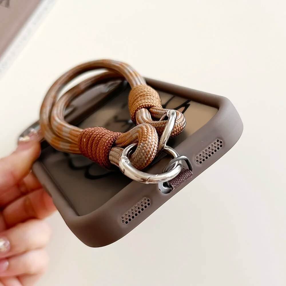 The case maintains a smooth, steady grip while the paracord lanyard adds carry control during walking or one-handed use. The raised camera frame provides surface separation when placed down, and the silicone shell keeps the profile slim without exposed gaps.
