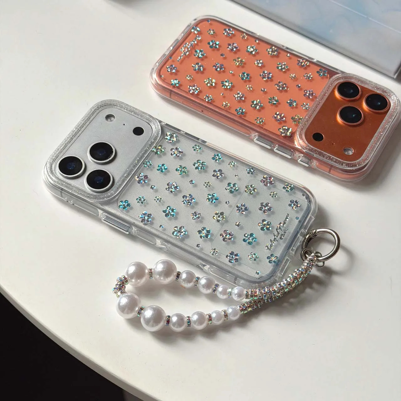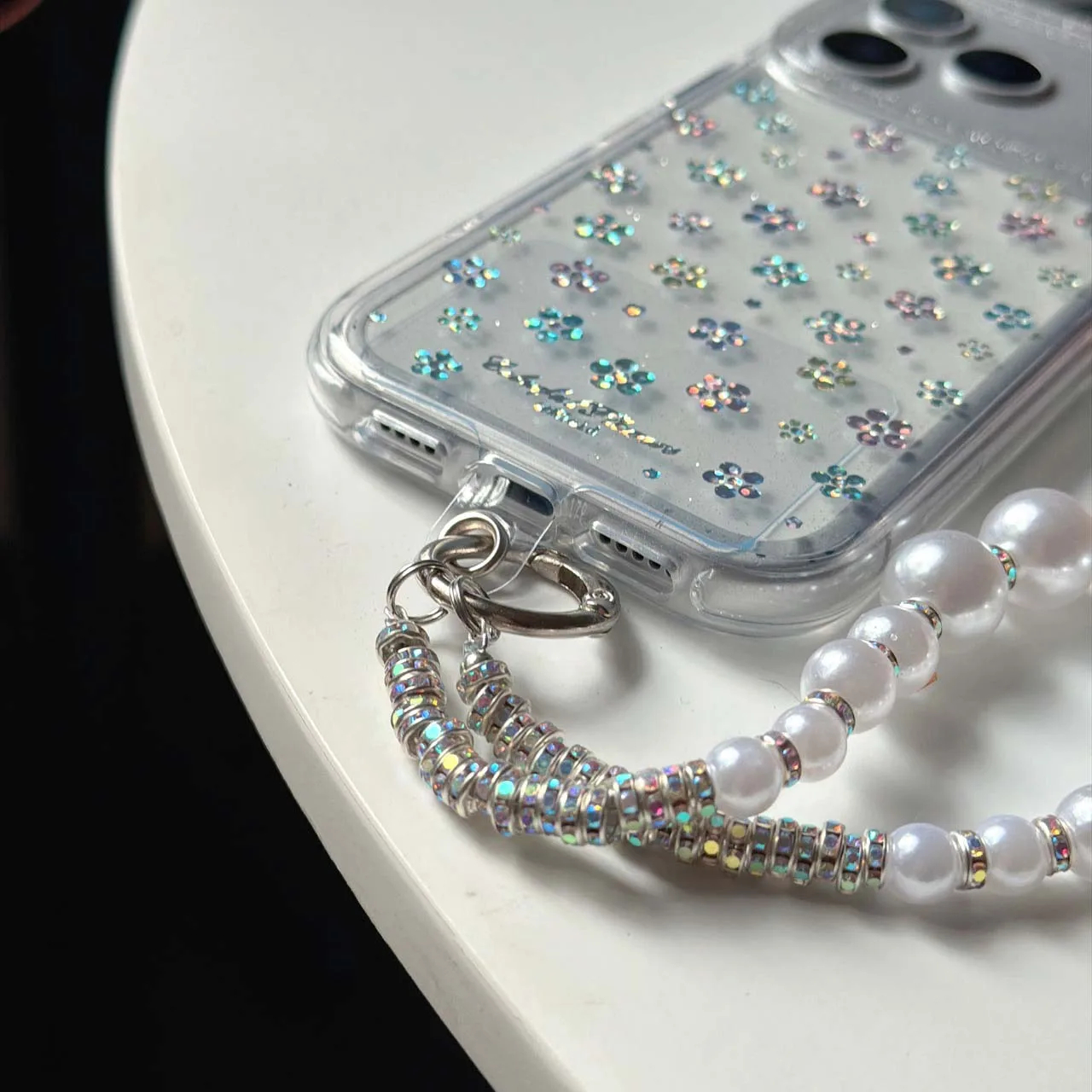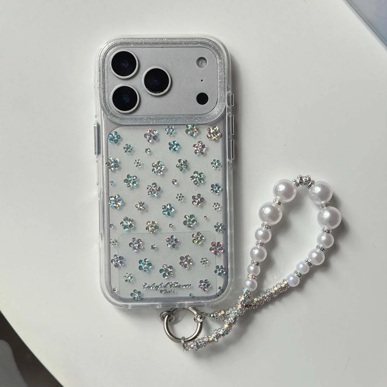 Features: Embedded glitter flowers, beaded wrist strap, metal attachment ring, raised edge around the camera