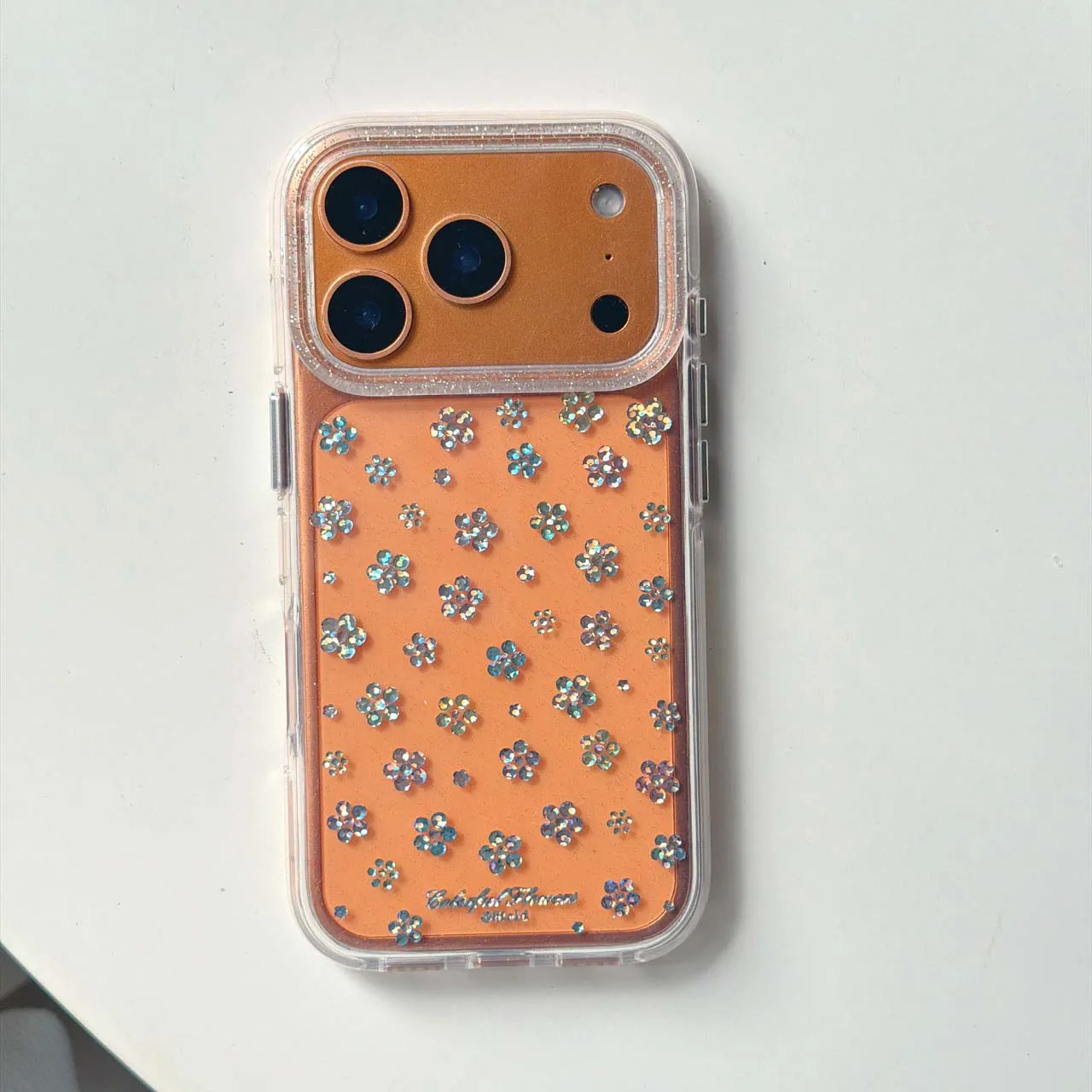 A glitter clear iPhone case with embedded reflective flower shapes set into the back, producing sharp light reflections instead of a flat shine. The shapes vary in size and spacing, with tighter clusters contrasted by more open areas across it.
