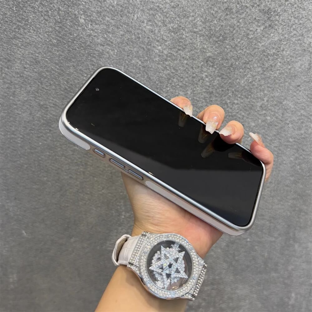 This iPhone case uses a leather back panel paired with a plated-finish frame that runs continuously around the perimeter and forms a raised camera surround. A stitched circular magnetic outline sits centered on the back, aligned with the internal magnetic structure beneath the leather surface.