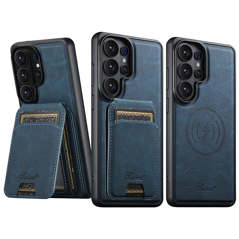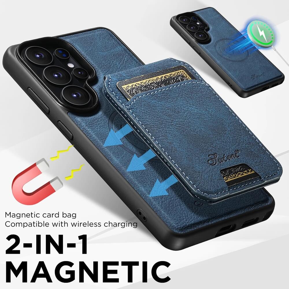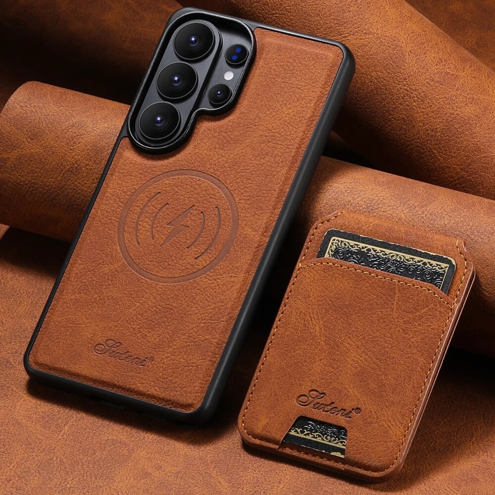 A detachable magnetic wallet secures to the back of the leather Samsung Galaxy case, creating a compact card holder that locks firmly in place and separates instantly when a slimmer carry is needed. Card slots inside the stitched wallet hold everyday essentials while the inner phone shell functions independently as a complete protective case.