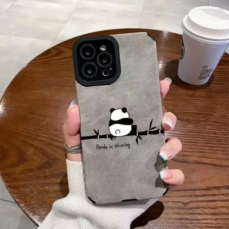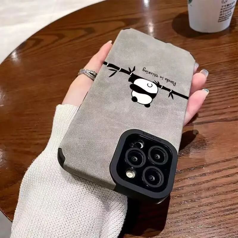 This phone case features a soft, matte gray surface with a suede-like texture, printed with a panda sitting on a bamboo line. The artwork is clean and centered, and the quote message “Panda in thinking” is part of the design.