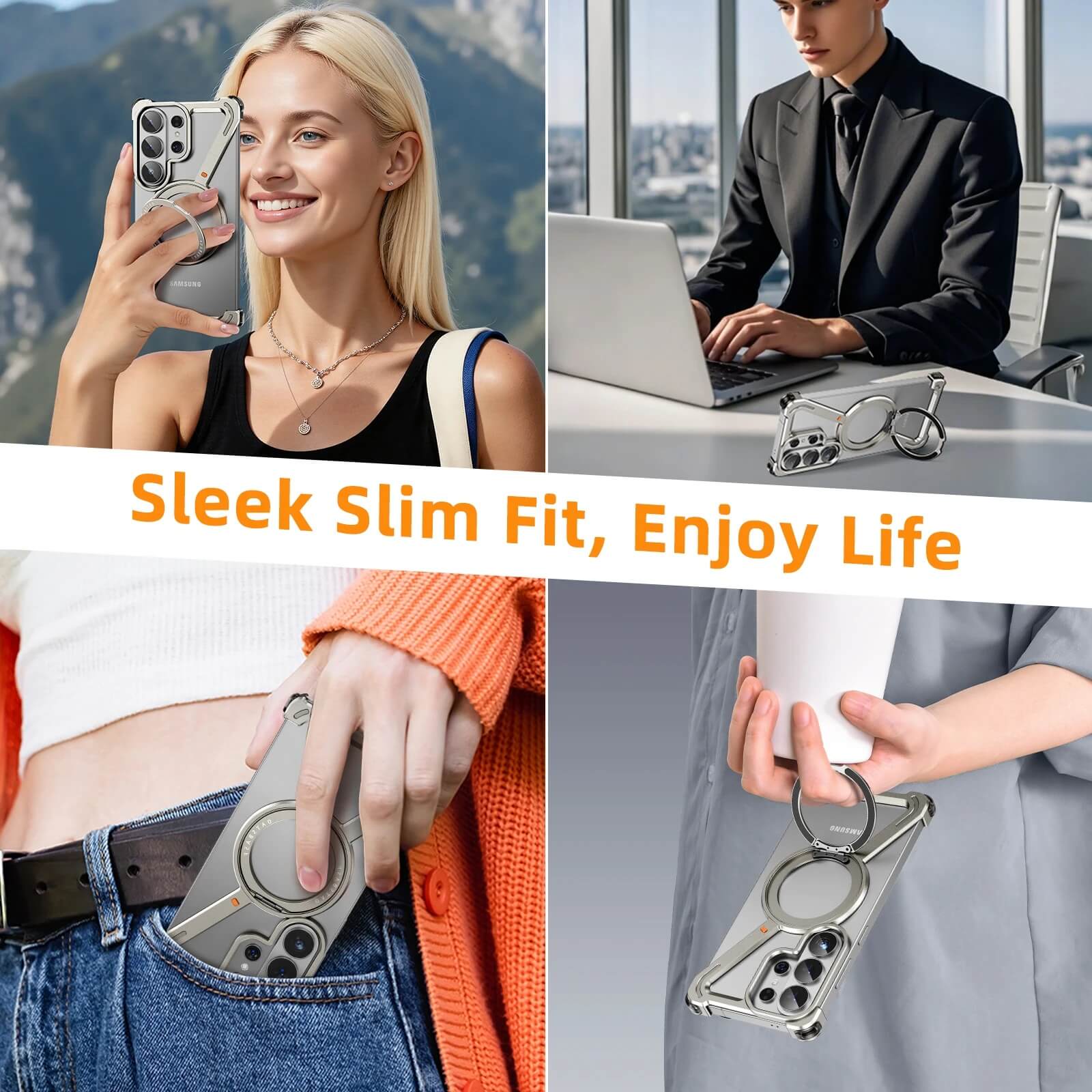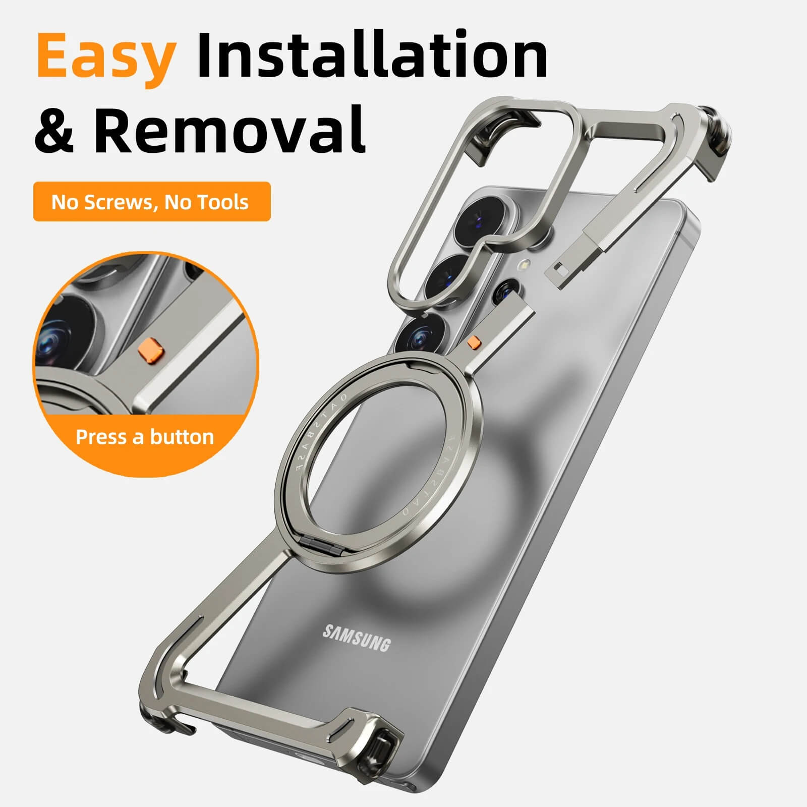 The rotating ring functions as a horizontal stand, vertical stand, or secure grip holder. A press-button release mechanism allows installation and removal without screws or tools.